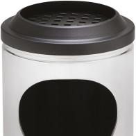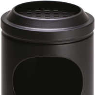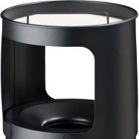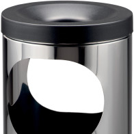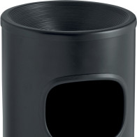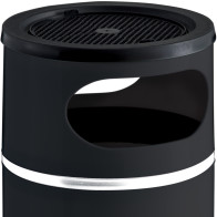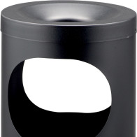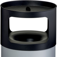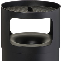 Corbeille antifeu ronde noir ou grise surmontée d'un grand cendrier en inox. La partie supérieure de la corbeille en forme d'entonnoir permet d'éteindre les flammes et la combustion à l'intérieur du corps du bac cylindrique. La tête cendrier se retire pour vider la poubelle par retournement. La partie supérieure du cendrier est prévue pour recevoir 1 kilogramme de sable inclus. L'ouverture supérieure de la poubelle empêche aux utilisateurs d'insérer des déchets de grande taille. La corbeille autoextinguible se pose et se retire tous simplement à l'avant d'un magasin ou d'un bar.