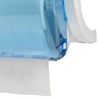 Ce distributeur de papier est conçu avec un fond en ABS gris et une façade en ABS bleu transparent, alliant robustesse et esthétique moderne.