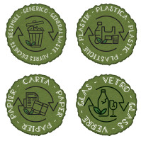 Elle est livrée avec des adhésifs pour une identification personnalisable des déchets, permettant une gestion efficace du recyclage grâce à des symboles et des couleurs distinctifs.