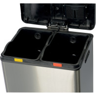 Grande poubelle double-flux à pédales design. 2 bacs plastiques intérieurs de 30 litres chacun pour le tri sélectif. Compatible HACCP. corresponds à une utilisation en cuisine professionnelle ou pour particulier. Affichage de couleur pour identifier les déchets.